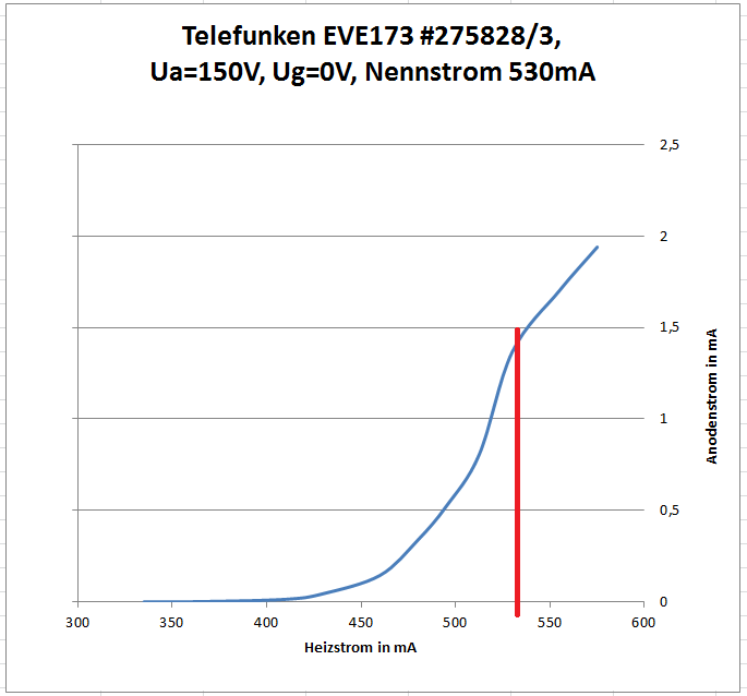 Eventuell wäre es sinnvoll gewesen, über einen 100k Ohm Widerstand an einem regelbaren DC-Netzteil festzustellen, ab wann eine Glimmentladung stattfindet. So liesse sich eine eventuelle Erhöhung der Anodenspannung abschätzen. Ich würde 27 Volt vorschlagen. Die Wolframtemperatur sieht auf dem Foto gut aus, wenngleich etwas zu niedrig, was einen enormen Einfluss auf die Emission hat. Der Schutz der Replik geht natürlich vor.