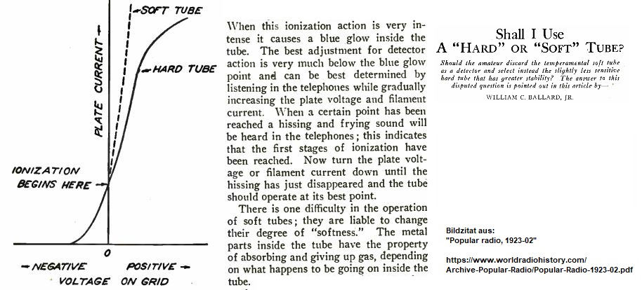 Im Gegensatz zur Hochvakuum-Röhre wurden solche Röhren ja an dem Punkt betrieben, wo die Ionisation gerade einsetzt, wo also die von der Katode abgehenden Elektronen zunehmand auf Gasmoleküle treffen.