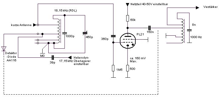 Die PL21 erfüllt schon mal den ersten Punkt auch an kurzer Antenne im VLF-Bereich. Das dürfte damit zusammenhängen, dass die Gitterstromkennlinie einen extrem scharfen Ausschlag in den negativen Bereich zeigt. (Funktechnik, s. "sokoll-link".) Auch der 2. Punkt scheint mit dieser Röhre erfüllt zu sein: Bisher konnte der Anodenwiderstand nicht unter 30 kOhm gebracht werden, ohne dass die Röhre zu "giftig" wurde, und hier war die Ausgangsspannung am hochohmigen 4000-Ohm-Hörer + Schalenkern-Übertrager geringer als die Eingangsspannung. Bei hochohmigem Abgriff (Röhre) Verstärkung etwa gleich 1.