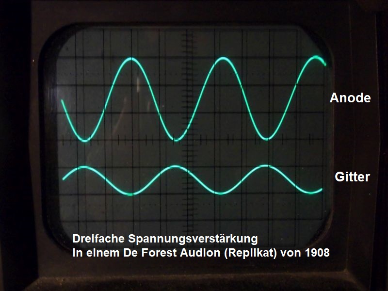 Zitieren:Der de Forest Gasdetektor mit Steuergitter in verschiedener Anordnung , der bereits einen Aufbau wie die dann folgenden Hochvakuum-Trioden hatte. (Zielrichtung Gleichrichtung von HF-Signalen) Anm.: Es ist wahrscheinlich, dass auch eine gewisse NF-Verstärkung stattgefunden hat.