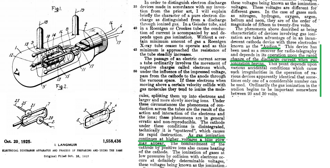 Die Theorien dazu und Methoden zur vollständigen Evakuierung und Beibehaltung des Hochvakuums wurden in Amerika von Langmuir entwickelt, hier ein Patent der von ihm entwickelten Röhre: