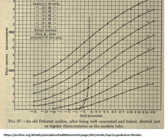 Die Arbeiten fanden mit Prof. Morecroft statt, dieser hat die Kennlinien einer erneut evakuierten"Audion"-Röhre in einem Buch eingestellt. Leider schreibt er nur von einer "frühen" de Forest-Röhre, aber nicht, ob es die 1-Platten oder 2-Platten-Version ist.