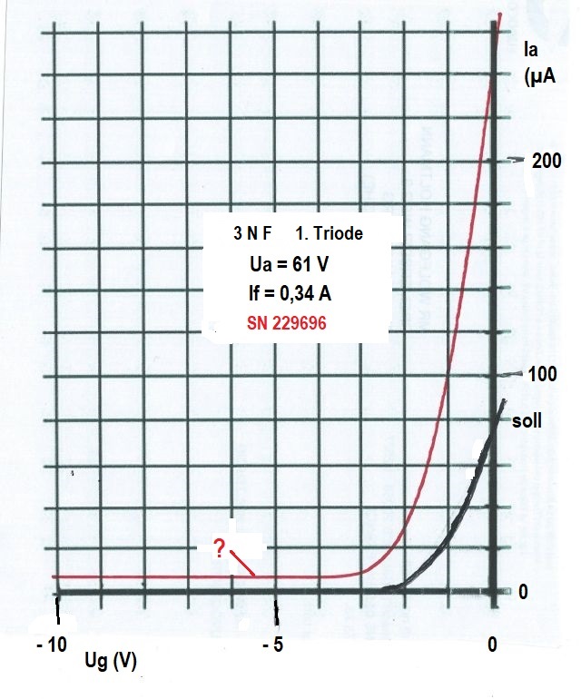 Was sofort auffällt, der Riesenunterschied im Anodenstrom (rot), welcher 3x größer als die Vorgabe (schwarz) ist !! Weiterhin erkennt man, dass der Ia nicht zu Null geht. Es bleibt ein gewisser „Schwanzstrom“, auch bei einer hohen -Ug. Darf ich andere Besitzer (Walter z.B.) einer 3NF bitten, meine Messungen zu wiederholen und bekannt zu machen. Herr G. Eisenbarth weist in seinem Buch „Die Loewe Mehrfachröhren“ (Seite 2.36) auf eine Verbesserung des 1. Systems während der Produktion hin.