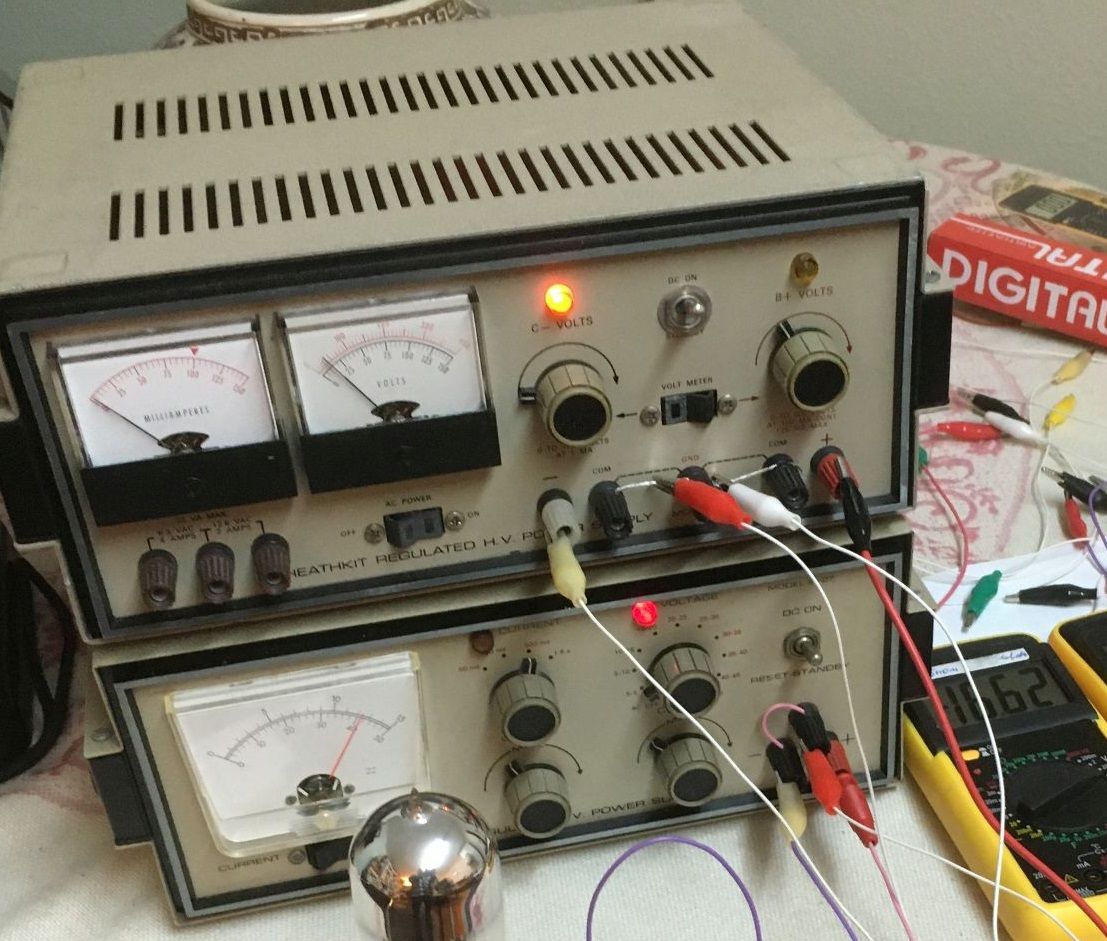 Der Reststrom im ersten System trat auch hier auf und liess sich selbst mit -125 Volt Gittervorspannung nicht auf Null bringen. Mehr kann das Heathkit Netzteil nicht liefern. Der Heizstrom betrug ziemlich genau 400mA bei 4V.