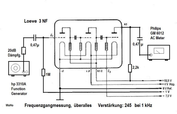Wie schon berichtet, hatte ich das Glück, ein beinahe 100%iges Exemplar zu erwerben. Damit wurde diese Messaufstellung gemacht: Man sieht, die Mehrfachröhre ist gegen Brummeinstreuungen metallisch abgeschirmt. Um eine Übersteuerung der 1. Triode zu verhindern, ist zusätzlich ein Dämpfungsglied eingefügt.