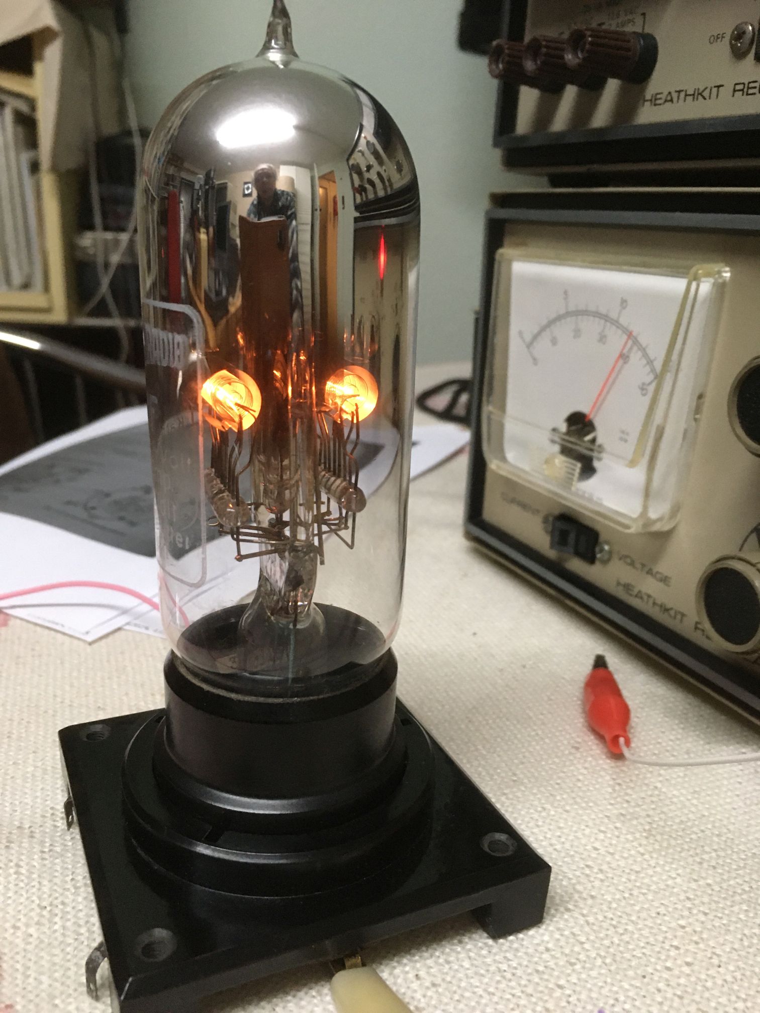 Es ist schon interessant zu hören, wie diese Röhren mit voller oder beinahe voller Emission Lautsprecherempfang vor knapp 100 Jahren realisieren konnten. Um deiner Bitte zu entsprechen, kam von meinen drei Exemplaren nur zwei mit herausgeführter ersten Anode in Betracht. Meine Wahl fiel auf die etwas "Bessere" # 647338, die freilich auch ausgelutscht ist.