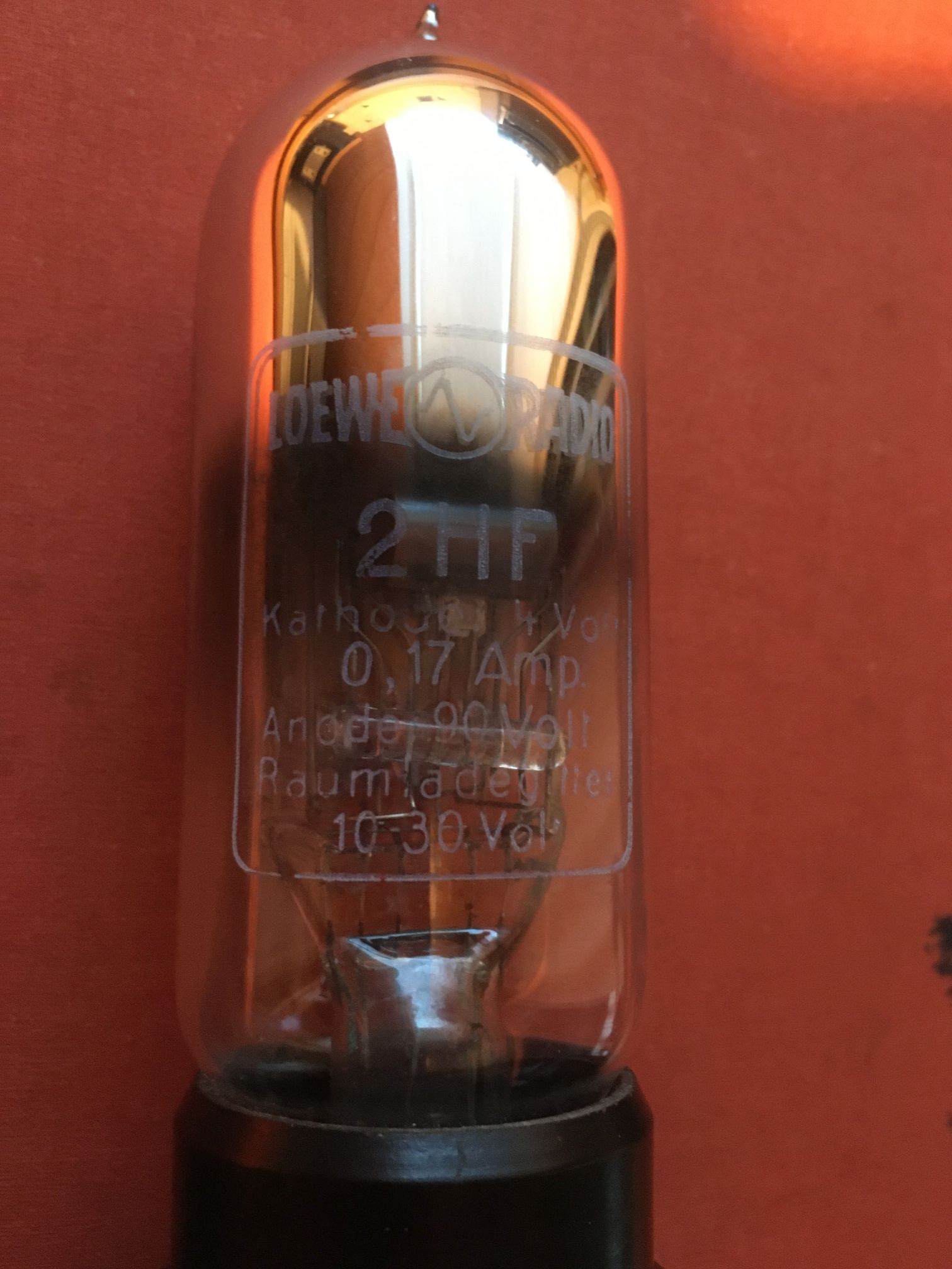 Um einen Eindruck der Helligkeit des Heizfadens zu vermitteln, zeige ich hier eine neuwertige 2HF, die ich vor einer Woche ebenfalls vermessen habe. Sie bildete bei Loewe zusammen mit der 3NF diverse Fernempfänger.