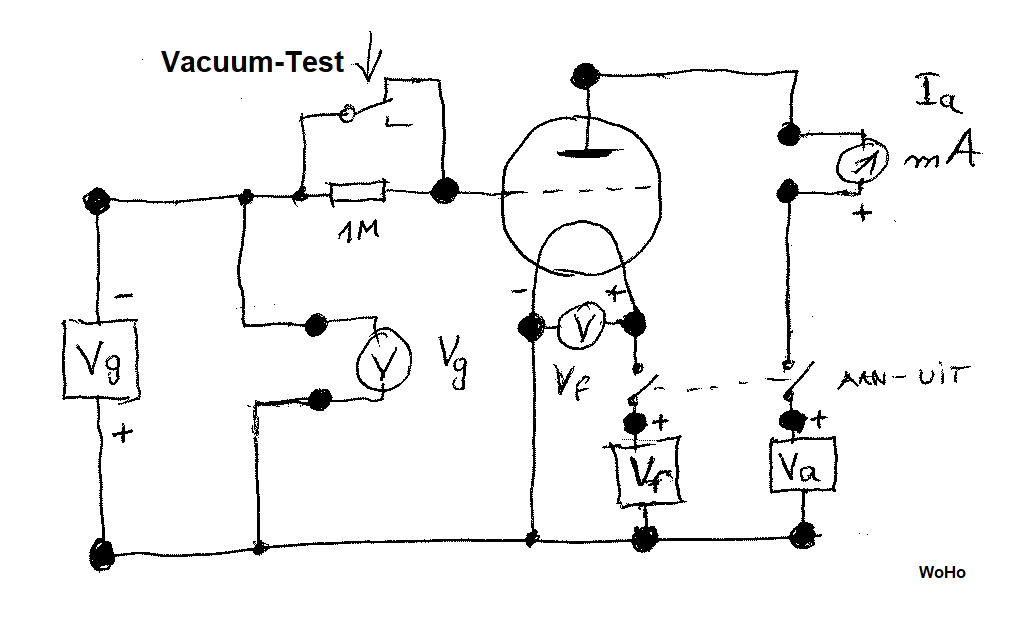 Ich wurde gefragt, wie kann man diese Röhren auf Verschleiß testen? Ein Röhrenprüfer für diese Typen steht nicht zur Verfügung! Also, wurde eben eine Testschaltung aufgebaut und der Anodenstrom bei festgelegten Spannungen am Faden, Gitter und Anode gemessen.