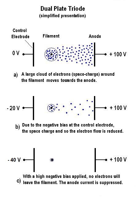 Wir sehen als Steuerelement eine Metallplatte in der Nähe des Fadens. Auf der anderen Seite ebenfalls eine Platte, welche die Funktion der Anode übernimmt. Die „Gridless Triode“ war geboren!