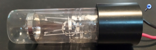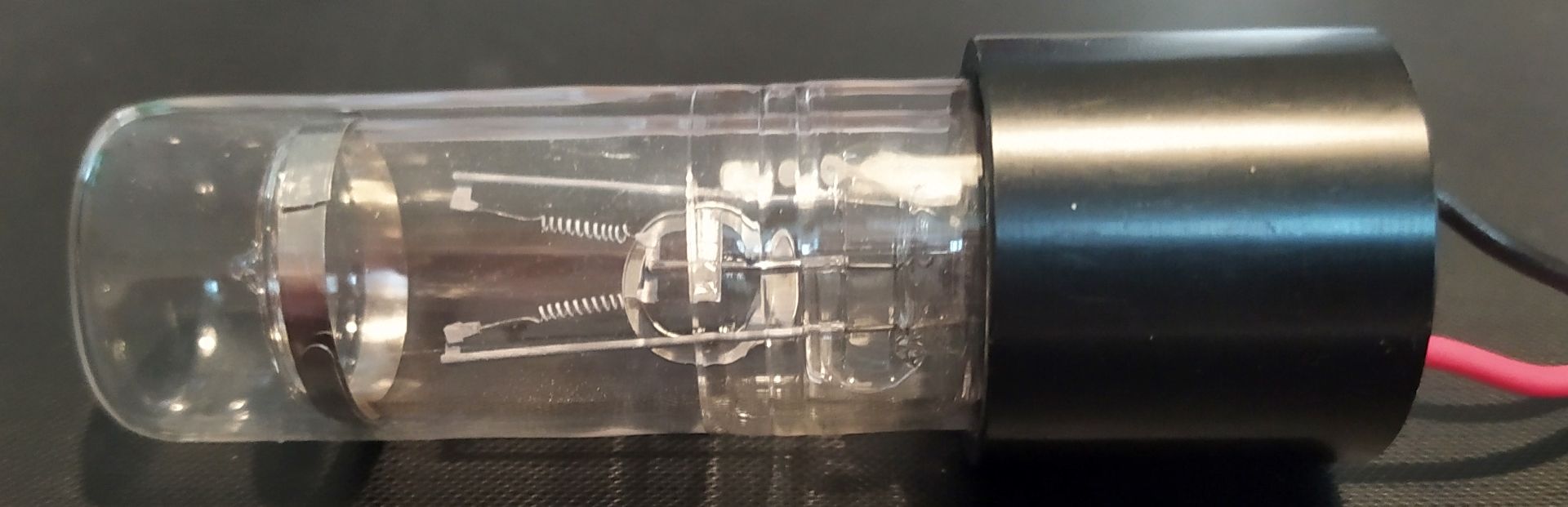 Wenn die Lampe nur zwei Anschlüsse hat, dann wird die Lampe nur mit einer geringen Spannung betrieben. Hiermit sollte die Glühwendel nur leicht glimmen, !nicht! hell glühen, denn dann wird sie durchbrennen. Um die Lampe zu testen kann man ein regelbares Netzteil verwenden. Hier fährt man die Spannung vorsichtig von 0V an langsam hoch. !!!UV-Strahlen!!!. Ich verwende immer ein oranges Plexiglas oder eine Brille mit orangen Gläsern. Da orange Gläser bei unterhalb ca.500nm sperren kann man zum Test eine Fluoreszierende Briefmarke verwenden.