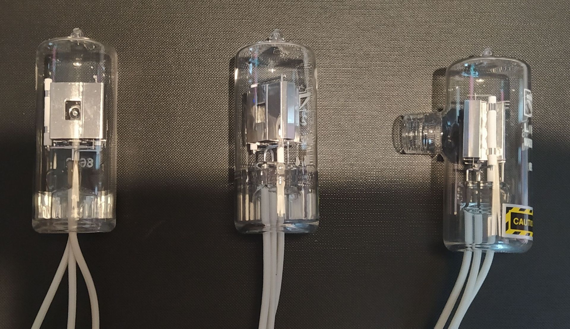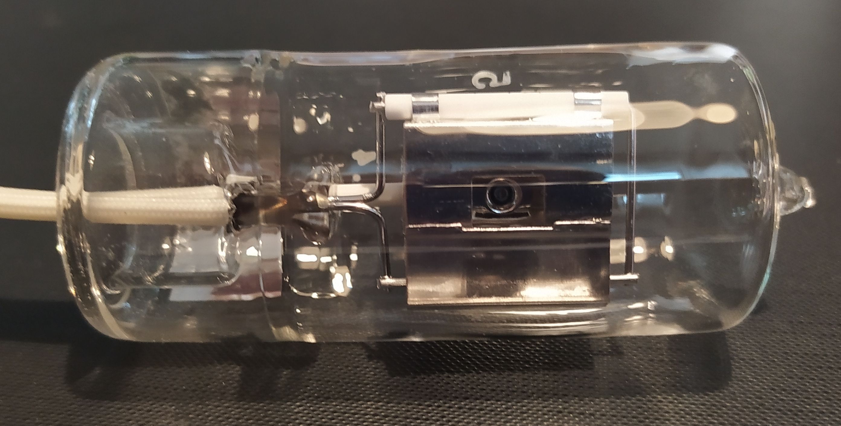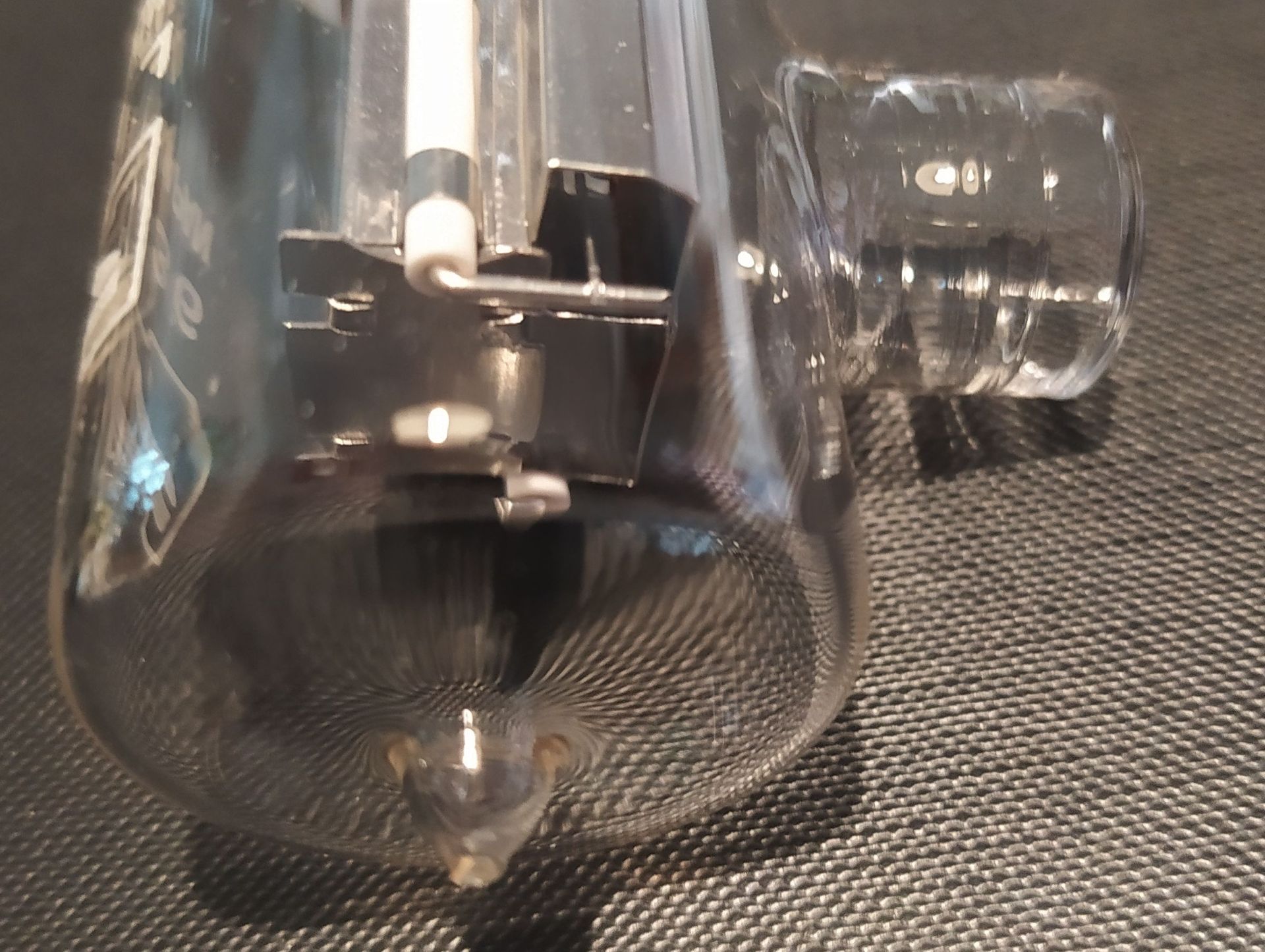 Bei genauem hinschauen kann man im mittleren Teil kleine Pünktchen erkennen. Ich vermute, dass es sich hier um Quecksilber handelt, das man mit den heissen Glühfäden verdampfen lässt, damit die Lampen starten. Natürlich müssen auch diese Lampen mit einem Vorwiderstand betrieben werden, denn wenn man die Startspannung erreicht (bei der das Quecksilber verdampft), dann würde die Lampe sonst im wahrsten Sinne des Wortes abdampfen. Wenn die Arbeitsspannung zu hoch ist, dann wird die Lampe nach kurzer Zeit innen schwarz.