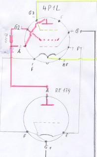 Hallo Jürgen rf, hallo Wolle, hallo ulmhorst, ich habe das einmal probiert und folg. Ergebnisse erzielt: Version G2 u G3 u Anode zusammen zieht viel zu viel, Stabi am RPG Funke W19 geht aus. Version wie gezeichnet: also G2 über 100 Ohm an Anode, G3 an Mittelanzapfung Heizung zieht immer noch zu viel. Jetzt den Schirmgitter Widerstand erhöht auf 32 k ergibt mit 24 mA gute Werte auf dem Funke ( gut beginnt bei 18 mA ). Das ist aber nur die halbe Wahrheit. Jürgen rf, ich müsste das Konstrukt bei Dir mal im Radio testen, da mein Lumophon ja noch nicht soweit ist und ich kein zweites Gerät habe in das eine Re134 passt. Nochmals danke an alle und viele Grüsse Jürgen H.