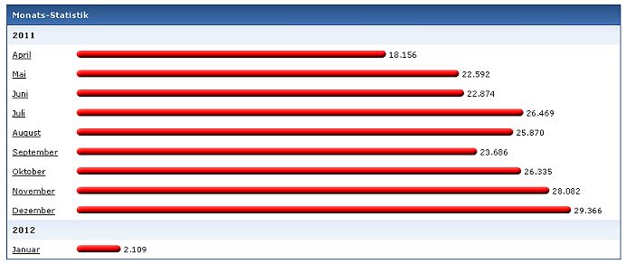 Seit April 2011 zeichnet die Forum-Software die Besucherzahlen in einer Monatsstatistik (Grafik) auf, leider nur für den Admin.