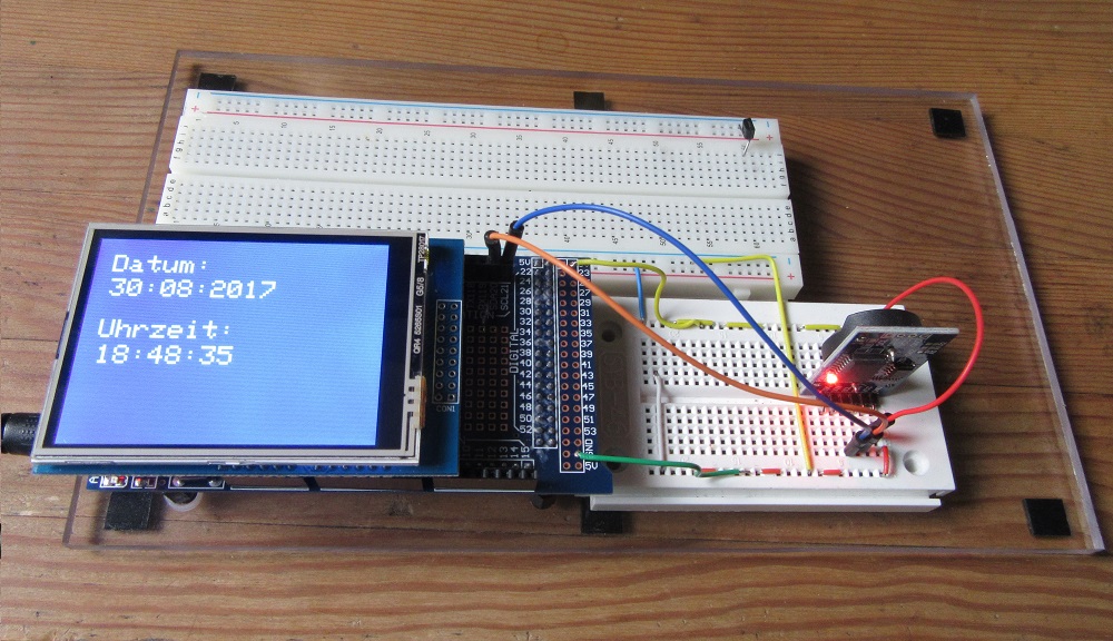 Dein Tipp mit dem Speichern von Werten und anschließendem Auslesen hat sehr gut geklappt. Das war die beste Idee überhaupt um das TFT in den Griff zu bekommen und das Flackern im Loop auszuschalten. Zum Testen habe ich mein RTC- Modul genommen. Das Entwicklungsboard zum Aufstecken kam auch zum Einsatz. 5V und GND musste ich zum RTC rausführen (löten) Die Curserpositionierung von Sekunden und Minuten war sehr mühselig, da das große TFT so viele Bildpunkte hat. Hier meine modifizierte Lösung der Funktion zeigeZeit(); mit Löschen der Ziffern durch Überschreiben in der Hintergrundfarbe aus dem Eprom. Damit Minuten und Stunden nicht im Sekundentakt blinken, habe ich weitere Schleifen gesetzt.