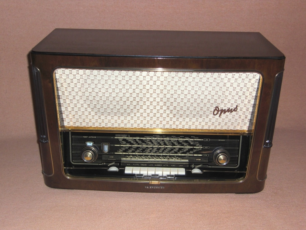 Hallo zusammen, das nächste Gerät für heute ist ein weiterer Telefunken Opus. Es handelt sich um den Opus 7 von 1956. Es war seinerzeit das Telefunken Spitzengerät. Ab 1953 gab es nicht mehr, wie die Jahre davor, über dem Opus noch ein höherwertiges Gerät. Der Opus 7 geht noch in seiner Grundform auf den Opus 55 zurück. Hatte nun aber für FM einen Kreis, und Klangtasten dazu bekommen. Ab Opus 55TS gab es dann auch seitlich strahlende Lautsprecher. Telefunken hat sich wohl noch nicht so richtig dazu entschließen können, die ganz an die Seiten zu setzen, und da auch zu lassen . Gleich zwei (hoch/mittel) auf jeder Seite, sind an den Gehäuse-Ecken als Schrägstrahler angebracht.