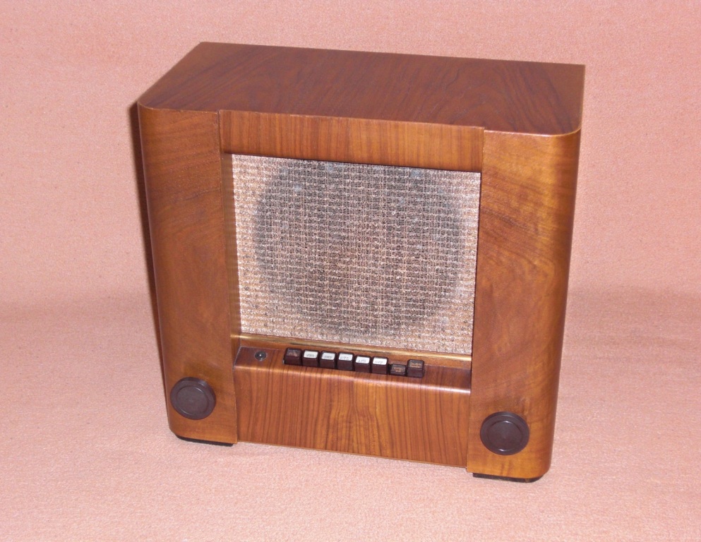 Hallo zusammen, das letzte Radio für heute, das ich euch vorstellen möchte, ist ein Sachsenwerk Olympia 405W von 1939. Das Besondere an dem Gerät ist, das es keine Senderskala und keinen Abstimmknopf hat. Es gibt nur Sender-Festtasten. Zwei für LW, und 6 für MW. Die Programmierung dieser Sendertasten erfolgte, hinter einer Abdeckung an der Unterseite, mittels Spindeltrimmer. Das Radio hat 6 Kreise und den Röhrensatz: ECH11, EBF11, ECL11 und AZ11. Es gab außerdem noch einen Klangregler. Dieser Super gehörte zu den preisgünstigsten des Jahrgangs.
