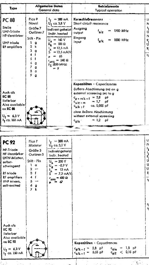 Zum Vergleich PC 92 PC 88. Es fallen die vielen Gitteranschlüsse der PC 88 auf, hier wurde eine Scheinbenförmiges Gitter gebaut um noch bis 850 MHz zu kommen. Ich meine so um 1961 - 62 kam die PC 88 auf den Markt um den Empfang im UHF Band für FS Geräte preisgünstig zu ermöglichen.