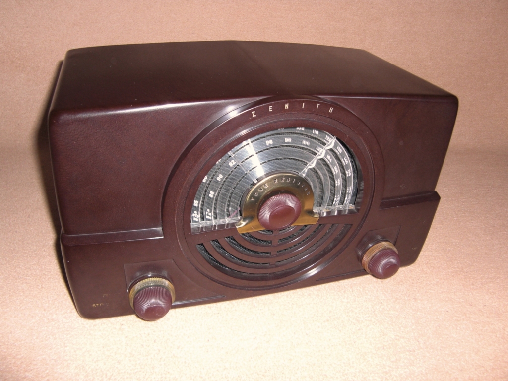 Hallo zusammen, heute mochte ich euch den Zenith 7H820W vorstellen. Dieses ca 1948 in den USA hergestellte Gerät, besitzt (neben M) schon einen UKW Bereich und empfängt sogar von 87 bis 108MHz! Es hat den Röhrensatz: 12BA6, 12BE6, 12BA6, 12BA6, 12AU6, 19T8 und 35B5. Übersetzt: HF93, HK90, HF93, HF93, HF94, HABC80 und einer 35 Volt Endröhre mit 0,15mA. Man erkennt daran, das dieses Gerät eine HF Vorstufe und mehrere ZF Stufen besitzt. Bei der 19T8 handelt es sich nicht ganz um eine HABC80, sie lässt sich aber problemlos durch sie Ersetzen. Diese Röhre kann also als Vorläufer, der bei uns später so populären EABC80, betrachtet werden. Man sieht also, wie weit FM bei den Amis zu der Zeit, als UKW bei uns noch in weiter Ferne war, schon entwickelt war (Armstrong System.) Nichts mit "Krückstock Pendler" oder gar Flankendemodulation .