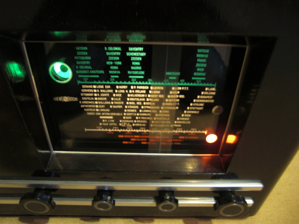 heute möchte ich euch das Loewe Radio Tosca von ca 1937 vorstellen. Dieses, in rötlichen Holzton gehaltene Gerät, wurde offensichtlich für den Export gefertigt. Die Rückwandbeschriftung ist in französisch und niederländisch (lässt auf Belgien schließen).