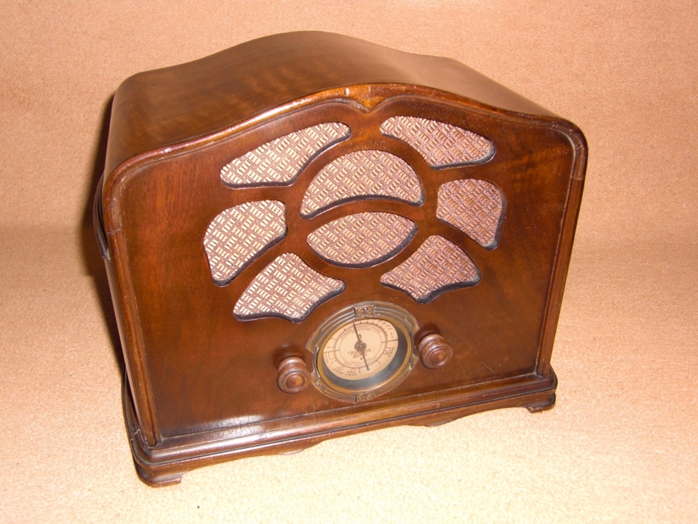 Hallo zusammen, als nächstes möchte ich euch den Emerson U6D von 1934 vorstellen. Dieses hübsche, relativ kleine (33,5 x 26 x 19,5cm) in den USA gebaute Gerät, hat ebenfalls einen Vorkreis. Insgesamt hat es 6 Kreise und empfängt die Wellenbereiche M und K. Die Bandumschaltung erfolgt per Drehknopf an der Rückseite. Es ist dabei immer nur der Skalenteil beleuchtet, der auch gerade benötigt wird. Der verwendete Röhrensatz ist: 6D6, 6A7, 6D6, 75, 43, 25Z5. Das Radio ist nur für 115 Volt Netze vorgesehen.