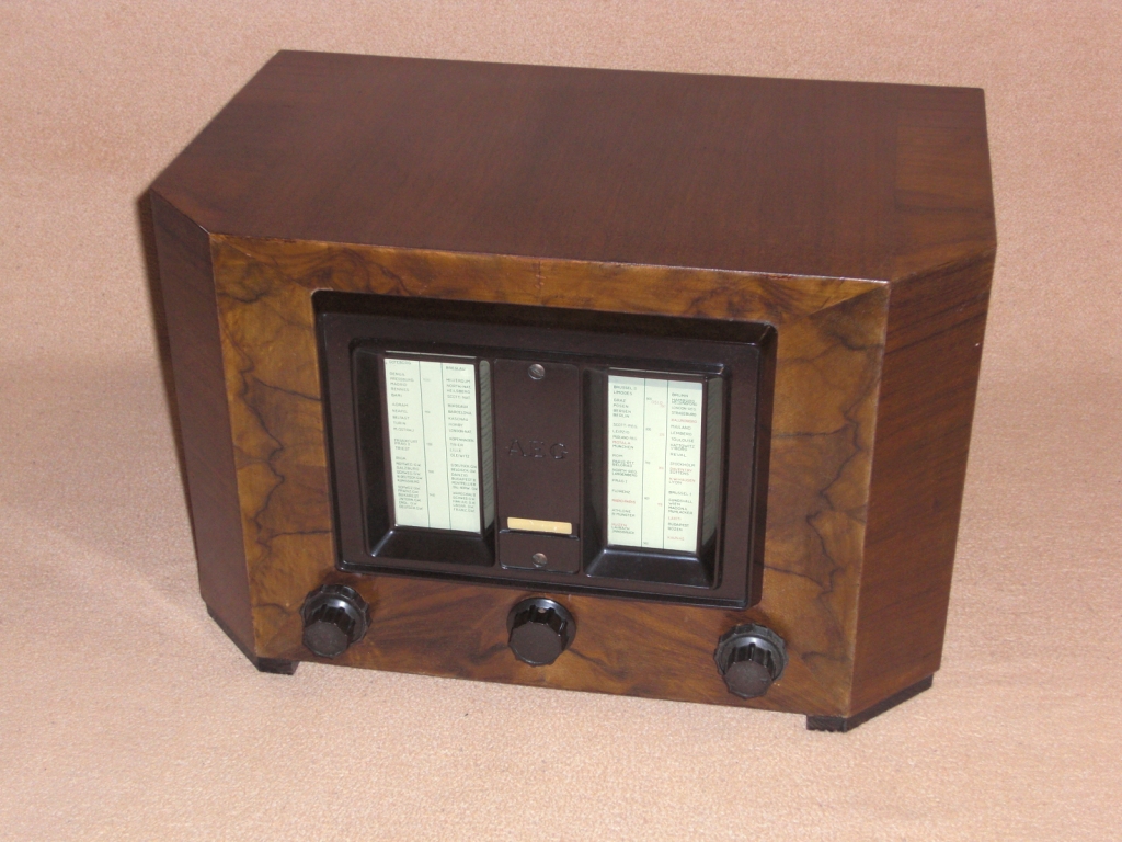 Hallo zusammen, und noch eines zum Abend. Bei dem folgenden Gerät, handelt es sich um einen AEG Ultra Geadem 304W von 1934. Dieser Dreikreis Geradeausempfänger, empfängt die Wellenbereiche L und M. Das Radio ist so trennscharf und empfindlich, das es keinerlei Rückkopplung benötigt. Es braucht sich daher nicht, hinter zeitgenössische Super zu verstecken. (Weder von den Empfangsleistungen, noch von der einfachen Bedienbarkeit) Statt eines herkömmlichen Skalenzeigers, gibt es einen Lichtzeiger. Die verwendeten Röhren sind: zwei mal RENS1234, REN914, RENS1374d, RGN1064.