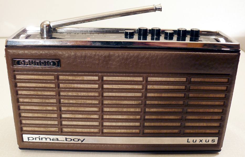 Herst. : Grundig Mod. : Prima-Boy Luxus 210 Jahr : 1970 -1972 Bes. : LW, MW, KW (49m-Band) und UKW Bem. : Batteriespeisung 5 x 1,5 V, auch Netzbetrieb möglich, Thermoplastgehäuse mit Kunstleder, Kofferradio