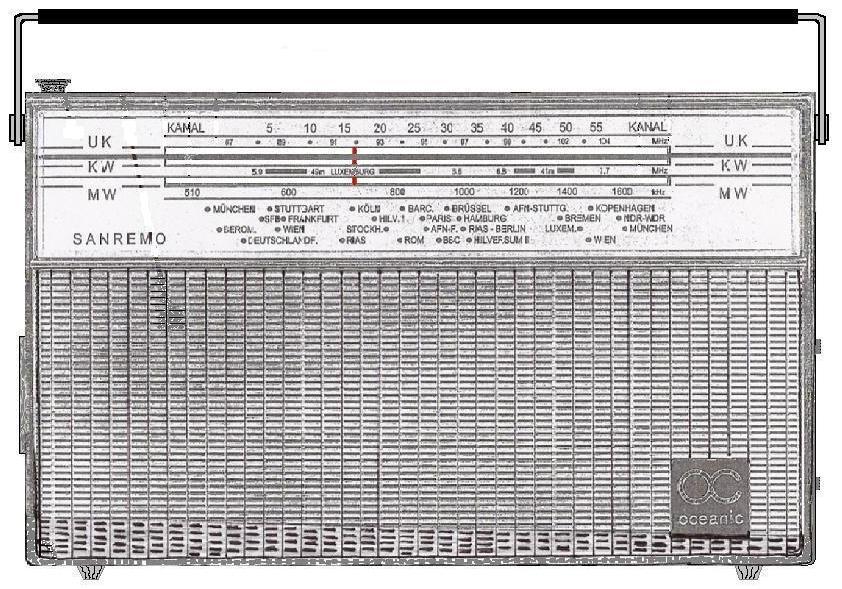 Erst beim dritten Lesen habe ich die Bemerkung "grün" verstanden, manchmal hat man ein Brett vor dem Kopf. Über die Modellbezeichnung Sanremo habe ich nichts gefunden. Auch zu Oceanic ist wenig zu finden, obwohl es bis Mitte der neunziger Jahre Geräte unter diesem Markennamen gibt. Das Gerät könnte baugleich mit einem Gerät von Schaub Lorenz sein, Mitte bis Ende der sechziger Jahre finden sich dort ähnlich ausgestattete Geräte, allerdings unter anderen Modellbezeichnungen.
