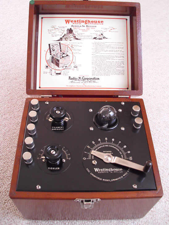 Es handelt sich um einen "Aeriola Senior" aus dem Produktionszeitraum von ca. 1922/23. Die ersten Modelle erschienen (technisch genauso) bereits 1921, hatten aber keine Bakelit-Bedienfläche, sondern eine aus lackiertem Holz. Außerdem waren die Regler mit vernickelten Platten unterlegt. Dieses Modell hier stammt aus dem zweiten Herstellungszyklus, der Mitte 1922 begann. Hersteller war die Firma Westinghouse aus den USA. Der "Aeriola Junior" war übrigens ein Detektor-Empfänger ....