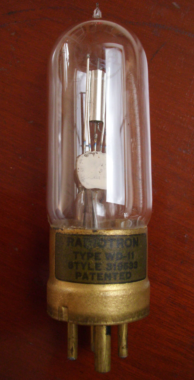 Die verwendete Röhre ist eine WD11 (Heizspannung 1,1 Volt / Anode 22,5 bis 90 Volt max) in der allerersten Ausführung - also noch mit Pumpstutzen und Messingsockel. Die nächste Generation hatte einen Bakelitsockel und einen kürzeren Kolben (die bekommt man dann ohne Ausbau des Gerätes nicht mehr aus der Fassung - ich hab´s ausprobiert !). Die Röhre ist ein "Dunkelglüher" und der Betrieb von außen fast nicht zu erkennen.