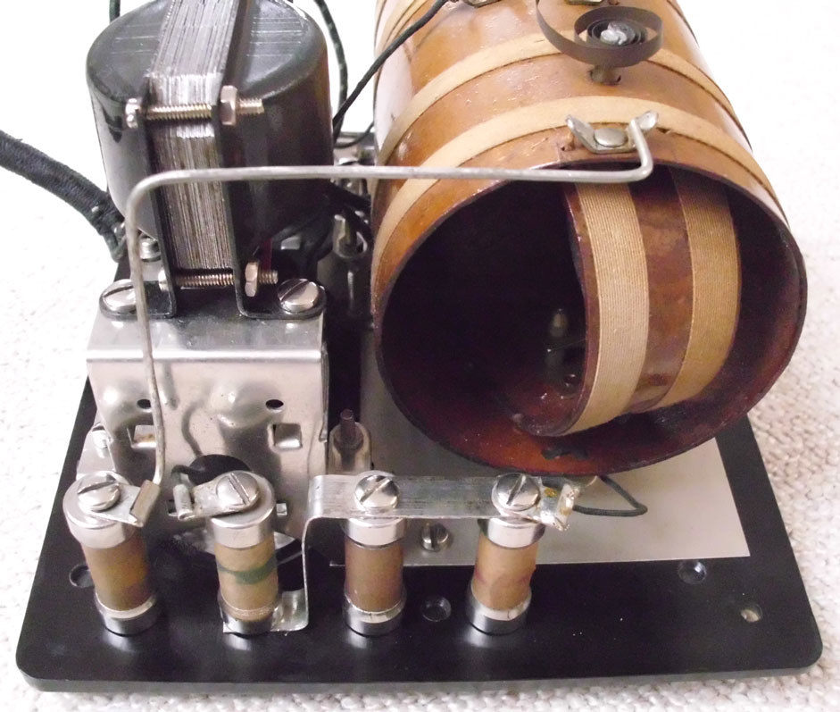 Die Abstimmung in diesem Empfänger erfolgt in der bewährten Variometerschaltung ohne Drehko. Auch die Rückkopplung erfolgt über ein weiteres Variometer (daher die beiden nebeneinander liegenden Regler). Die Heizspannung von 1,5V max wird über das große Poti eingestellt und soll bei den Röhren nur zu einem ganz dunkelroten Glühen führen (sieht man eigentlich nur bei fast vollständig gedimmten Licht); mehr schadet den sehr empfindlichen (und teuren) Rohren!