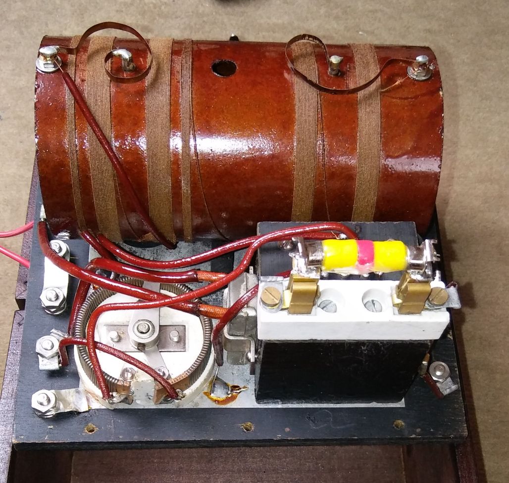 Eine Überrestaurierung kam nicht infrage. Aber die Suche nach einem Ersatz für die fehlende Gitterkombination war schwierig. Letztlich habe ich die Keramik-Fassung für einen Eisen- Wasserstoff-Widerstand aus den 1920'er Jahren für eine EVN171 genommen. Die übrige Instand- setzung war an einem Vormittag erledigt. Gestern Mittag habe ich den Empfänger nun in Betrieb genommen und war von der Empfindlichkeit angetan. Wawre 621 kHz war sehr laut, Solt/Ungarn auf 540 kHz (in der Mittagszeit!) und einige Engländer waren gut verständlich. Die Dimensionierung und Güte der Variometer ist herausragend. Ich habe noch nie mit einem Ein-Röhren-Audion kurz vor dem Rückkopplungseinsatz das Antennenrauschen hören können. Zwar auf Kosten der Selektivität ist halt die Verwendung eines Serienresonanzkreises immer dann anzuraten, wenn es um höchste Empfindlichkeit geht, denn Kopplungsverluste zur Antenne bestehen so nicht. Mein Chelsea No101 aus der gleichen Zeit macht das ebenfalls so.
