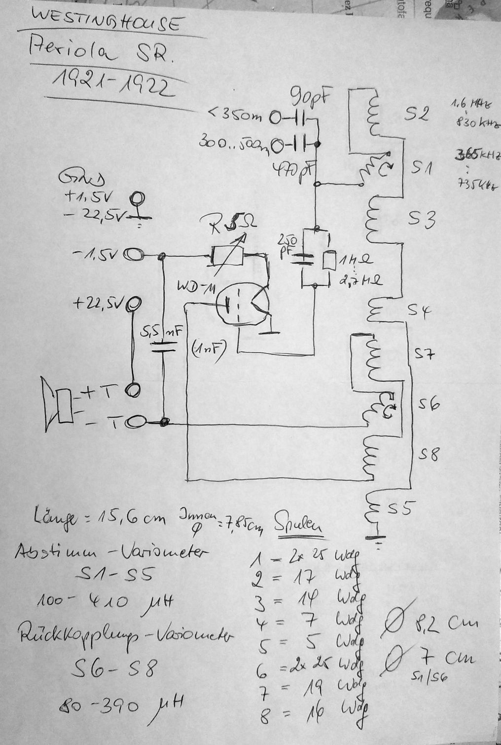 Beide Variometer (Abstimmung und Rückkopplung) lassen sich zwischen ca. 100 und 400 µH abstimmen. Die Schwingkreisfestkapazität beträgt 470 pF für 350 bis 500m und 90pF für < 350m. Datenblätter für die WD-11 raten zu einer Gitter-R/C-Kombination von 250pF und 2...3M Ohm. Ich habe den Wert 2,7 M Ohm gewählt. Den Wert des Kopfhörer-Kondensators habe ich mit 5,5 nF gemessen. Der Heiz- Drehwiderstand hat einen maximalen Wert von 5 Ohm. Ich bin mit einer Bleizelle von 2 Volt besser zurecht gekommen als mit einer empfohlenen Trockenzelle von 1,5 Volt. Der Heizstrom sollte mit einem mA-Meter auf den Sollwert von 250mA überwacht werden. Der typische Lautstärkeverlauf einer Wolframröhre liegt nicht vor. Die WD-11 hat schon eine Oxid-Kathode, und die Rheostat Einstellungsanweisung von Westinghouse bezüglich Dunkelglut ist absurd. Es wundert mich nicht, warum so viele Röhren zwischen 1921 und 1923 verheizt wurden und Westinghouse bzw. der Nachfolger RCA zu einem Umbau auf UV-199 oder ähnliche Trioden riet. Ich habe auf U-Tube auch 3 Videos gesehen, in denen die stolzen Vorführer des Aeriola völlig planlos den Heizungsregler hin- und her und bis zum rechten Anschlag gedreht haben. Bei meiner WD-11 gibt es zwischen 200 und 250mA im Gegensatz zu Röhren mit Wolframheizfäden keinen Lautstärkeunterschied.