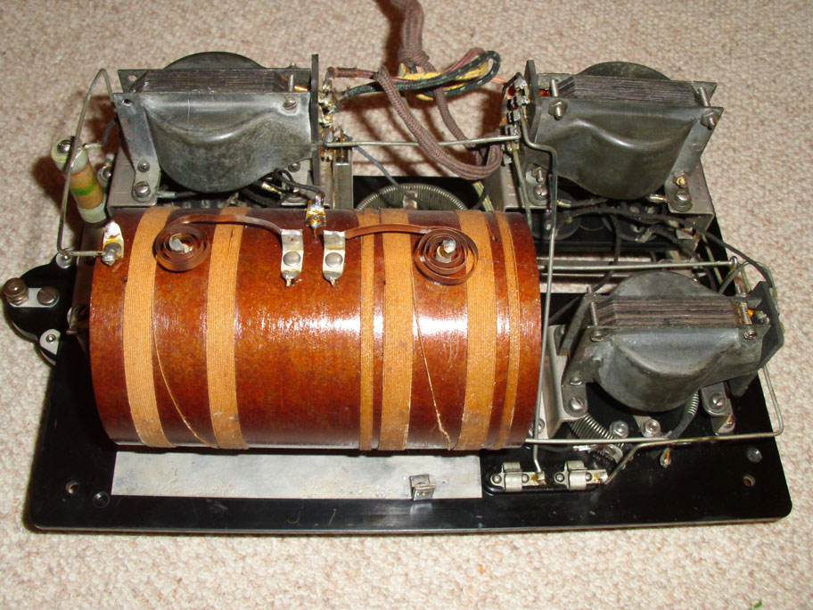 In diesem Gerät hier sind wiederum die originalen WD-11 als Röhren vorhanden, allerdings in der letzten ("modernsten") Bauform (schlanker Kolben, voll vergettert, kein sichtbarer Pumpstutzen). Ich habe die Röhren im Verstärkerteil mal gezogen, damit auch der Sockel sichtbar wird. RCA hat übrigens noch während des Produktionszyklus dieser Geräteserie Ergänzungsschaltpläne und Zwischensockel herausgegeben, damit die Geräte auf leistungsfähigere Röhren vom Kunden oder versierten Bastler umgestellt werden konnten. Die WD-11 waren zu empfindlich; ihr größter Nachteil war zudem, daß beim Durchbrennen eines Heizfadens dieser gegen die Anode schlug und einen Gesamtkurzschluß zwischen allen anderen Heizungen (die ja parallel geschaltet waren) und der Anodenspannungen erfolgte - ging also eine Röhre drauf, zog sie unter Umständen alle anderen mit in den Tod!