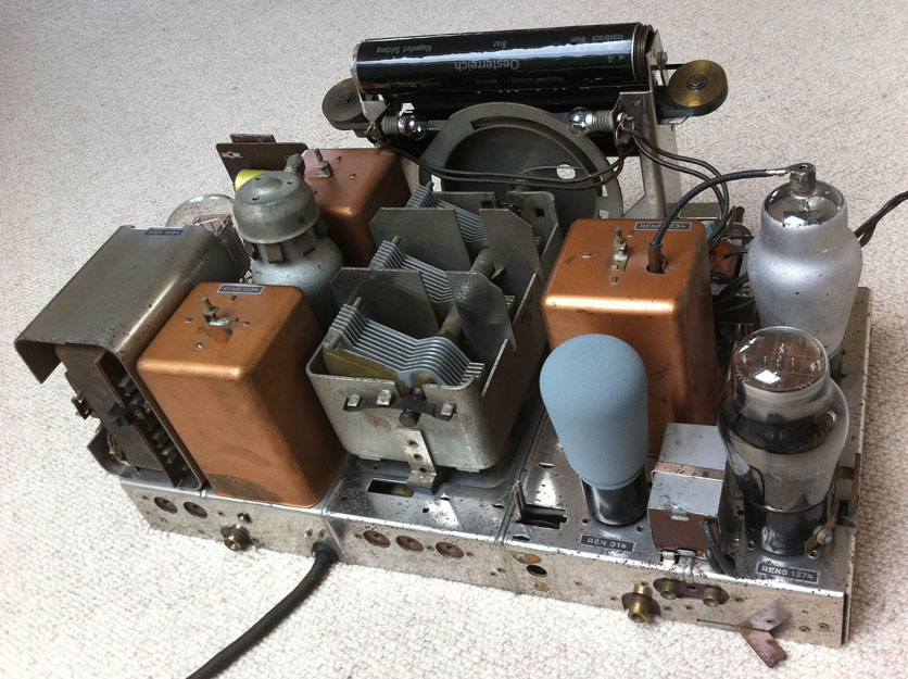Mit Ausnahme von zwei Becherkondensatoren, deren Schränklappen unter dem Trafo, bzw. unter dem Drehko enden und die sich deshalb einem Ausbau heftig wiedersetzen, sind alle C´s ausgehöhlt und mit neuen Exemplaren neu befüllt worden - ich gehöre der Fraktion von Sammlern an, die auf einen möglichst originalgetreues Erscheinungsbild Wert legen (die Diskussion im Forum ist wohl bekannt). Ausgefallene Widerstände sind durch passende Originale ersetzt worden. Ansonsten sind Chassis und Gehäuse auch optisch aufgearbeitet und erstrahlen wieder im alten (neuen) Glanz.