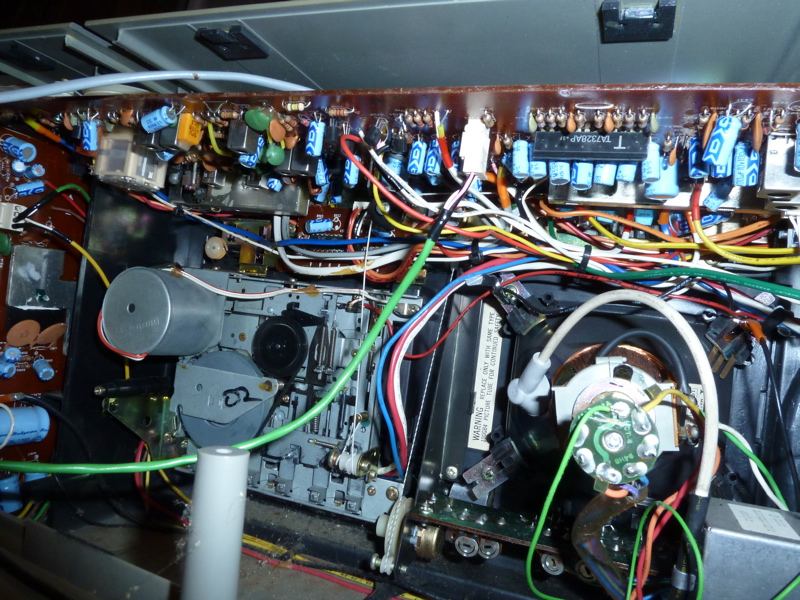 Innereien, wie man es sich von den japanischen Geräten gewohnt ist: Leiterplatten im ganzen Gehäuse verteilt und unzählige Kabel...