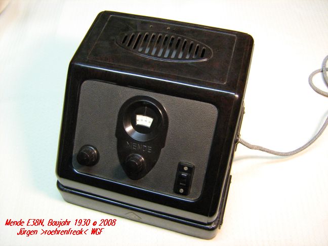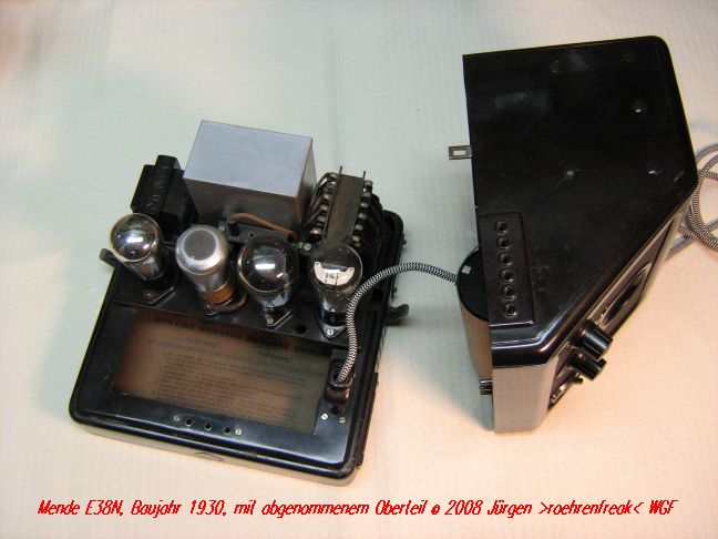 Bild 1: Ein Mende E38N, Bj.1930, vier Röhren (REN1104, REN1004, RES164d, RGN354), Geradeausempfänger, mit extern angeschlossenem Lautsprecher. Bild 2 zeigt einen Blick ins Innere dieses, wie ich meine, hübschen Radios. Es ist voll funktionstüchtig und war "Liebe auf den ersten Blick" auf einer Radiobörse 2007. Ich musste es einfach haben