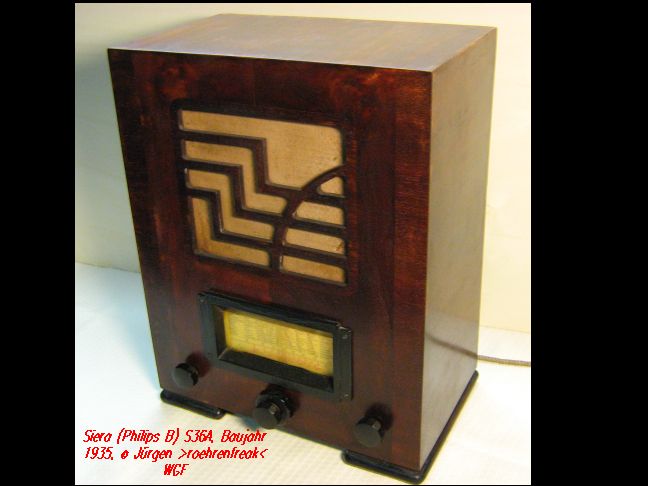 Bild 3: Unter dem Namen "Siera" baute Philips in Belgien diesen S36A um 1935. Bestückt ist dieser Superhet (ZF 115kHz) mit den Röhren FC4 (=AK1), VP4A (=AF2), 2D4 (AB1), SP4, PM24M, DW2X (alle von Mullard, einer Philips-Tochter). Als ich dieses Radio vor über 20 Jahren auf einem Elektronik-Flohmarkt in einem grausigen Zustand fand brach es mir fast das Herz. Für DM20,-- konnte ich´s dem Kerlchen abschwatzen. Voll restauriert und spielbereit ziert es den "Tresen" am Eingang meiner Werkstatt.