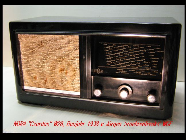 Bild 5: Diesen NORA "Csardas" W28 aus 1938 fand ich vor 22 Jahren auf einem Open-Air-Flohmarkt nahe Dortmund - bei strömendem Regen!. Das Glück war mir hold, hat der Apparat doch gottlob dadurch keinen Schaden erlitten. Die Restaurierung war dann kein Problem. Bemerkenswert: Obwohl der Superhet bereits etabliert war handelt es sich bei diesem Gerät um einen Geradeaus-Empfänger mit den Röhren AF3 (HF-Vorstufe), AF7 (Audion), AL1 (Endstufe) und AZ1 (Netzgleichrichter). Und die Empfangsempfindlichkeit kann sogar mit einem Super mithalten!