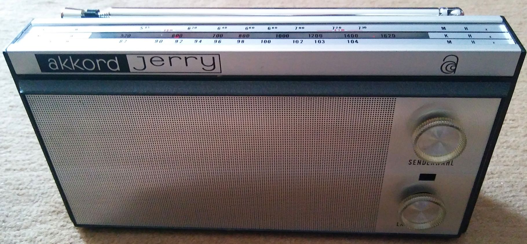 Das Gerät arbeitete nach Austausch der 6 Elkos auf Anhieb einwandfrei. Die Empfindlichkeit auf Kurzwelle mit der eingebauten Ferritantenne ist erstaunlich gut, auf UKW eher durch- schnittlich, Mittelwelle perfekt. Der Akkord Jerry dürfte bereits unter der Führung von Bosch eines der allerletzten Radios unter dem Markennamen Akkord sein. Zu dem Gerät wurde firmentypisch eine schwarze Tragetasche aus Kunstleder beigelegt. Besonders putzig ist das kleine Ohrhöreretui.