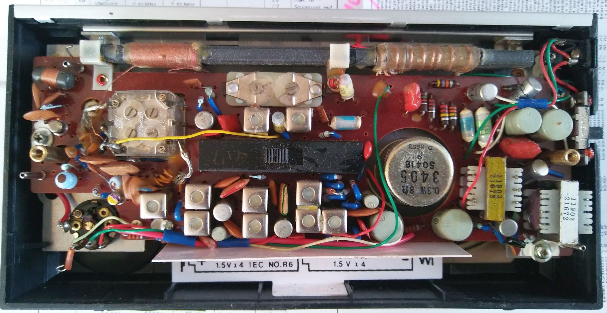 Schaltung: Superhet Transistoren: 9 Germanium (2x 2SA240, 2SA433A, 2x 2SA77, 2x 2SB54, 2x SB56) Kreise: AM: 6, UKW: 7 Frequenzen: KW 5,8-7,35 MHz, MW, UKW bis 104 MHz Lautsprecher: 1 oval (9,5 x 5,5 cm, 8 Ohm) Spannungen: 4 x 1,5 Volt Mignon Gehäuse: Thermoplast schwarz Skala: Analog in horizontaler Zeiger-Laufrichtung. Abstimmung: Drehkondensator Komfort: Tonblende-Umschalter Gewicht: 0,8 kg Maße: 19,0 x 9,5 x 5,0 cm Besonderheit: Kurzwelle mit Ferritantenne