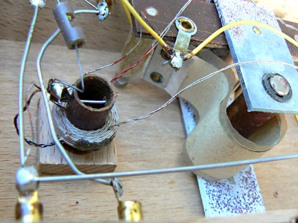 Erwähnenswert ist die offene Diode und, der Not der damaligen Zeit geschuldet, der Wickeldrehko. Er besteht aus zwei Alufolien mit Isolationszwischenlage.