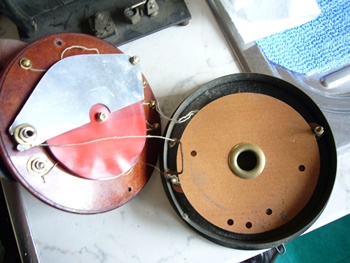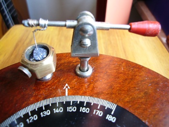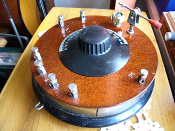 Es könnte auch ein älterer Eigenbau sein. Die Präzision des Gehäuses, Nietungen und Verarbeitung sprechen aber dagegen. Die Anschlüsse der Spule sehen nach HF-Litze oder seidenumsponnenen Cu- Volldraht aus. Die Form des Drehkos spricht für eine lineare Kapazität und hat doch eine ungewöhnliche Bauform. Es ist ein Primärempfänger, im Detektorbecher schimmert noch der Bleiglanzkristall. Die Bezeichnungen auf der Hartgewebeplatte A/E /Pfeil/ sehen nach Fabrikation aus. Das Gerät wird mit höchster Warscheinlichkeit kein Radioamateur gebaut haben. Auch der Detektorarm mit Griffgummierung spricht dafür. Schönes Teil
