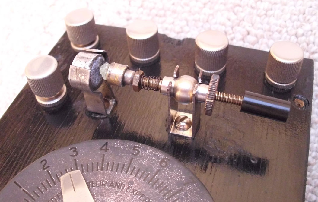 In die beiden Buchsen mit 19mm Abstand passen die Standart-Detektoren. Ein Perikondetektor aus dem Jahre 1920 ist fest montiert. Man kann den Zinkit-Kristall, der unter Federspannung steht, von dem Bornitkristall wegziehen und mit der kleinen Rändelschraube fixieren. Ich kann aber auch 2 Detektoren parallel betreiben. Wird durch Einstecken des Zusatzdetektors die Lautstärke grösser, war die Einstellung des Perikon nicht optimal. Auf Langwelle liegt bei mir das Rauschen mit 24 dBµV/m recht hoch und ist mit dem Perikondetektor und absoluter Stille durchaus noch im PX-200 Kopfhörer ganz leise zu hören. Auf Mittelwelle fällt die Lautstärke gegenüber einem Bleiglanz-Bronzefeder-Detektor, der gleichwertig einer Schottkydiode ist, ab - wahrscheinlich wegen der erhöhten Kapazität.