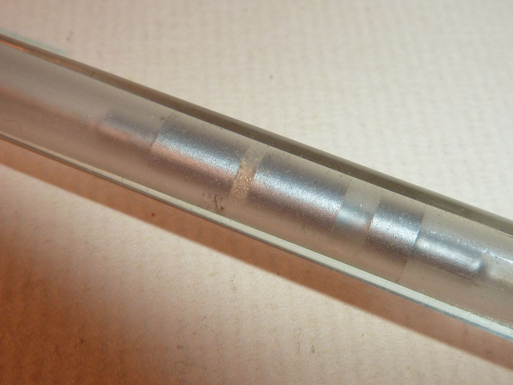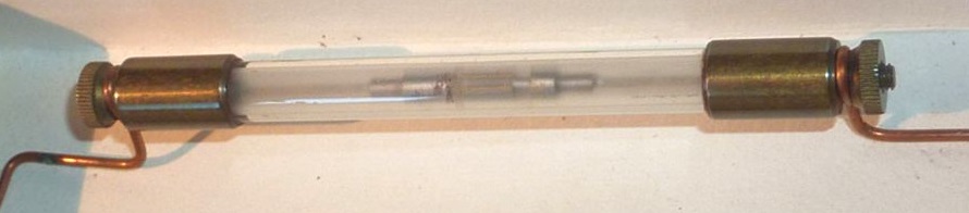 der französische Kohärer wirkt an den Elektroden eher wie eine Replik. Das sieht innen nach einer modernen Fertigung aus. Warum diese Unsymmetrie ?? ....diese ist technisch nicht nachvollziebar. Die Späne sehen nach Nickel / Silber aus... der frühe Branly war mit Eisenspänen gefüllt und nicht luftleer. Branly war Physiker.... kommerziell wurde dieses Prinzip durch entsprechende Firmen angeboten. ( Siehe Bernds Link )