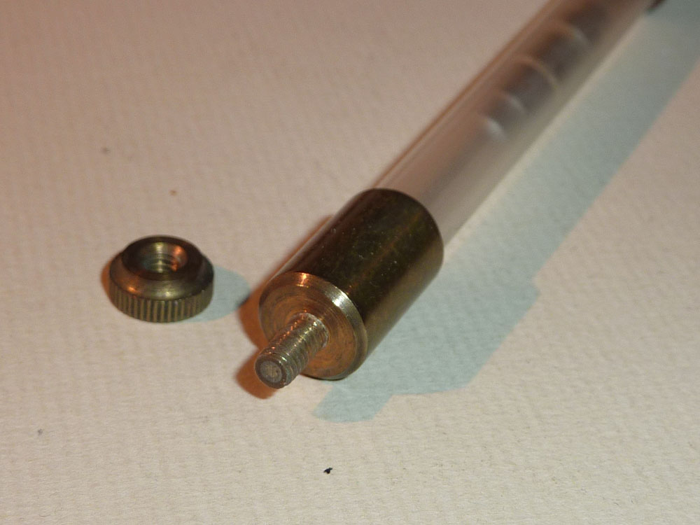 die Bilder sprechen für den frühen Branly Aufbau. Die beiden Elektroden haben noch keine Abschrägung. Ich bin mir ziemlich sicher das Marconi dieses konstruktive Element in empirischen Versuchen gefunden hat und sich auch die Füllung aus 95% Nickel und 5% Silber hat patentieren lassen. Was an der Nahaufnahme der Elektroden interessant ist, dass diese nicht ganz symmetrisch aufgebaut sind. Kann es sein, dass sich rechtsseitig eine Stellmögichkeit über ein Innengewinde verbirgt?