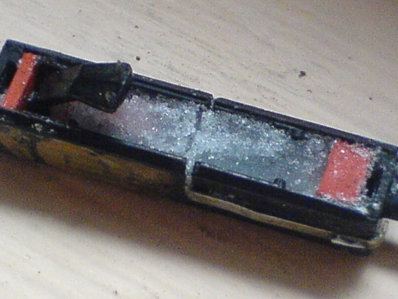 das Salz ist ja weiß. Dann hat sich die alte Masse durch Korrosion verfärbt. Bei mir ist das Salz maximal bis über das spitze Gummiteil drin. Die Kontakte 5 stehen sich mit ihren gebogenen Enden mit ca. 1 mm Abstand unter Teil 3 gegenüber. Ich denke das Salz muß trocken (lose) sein.