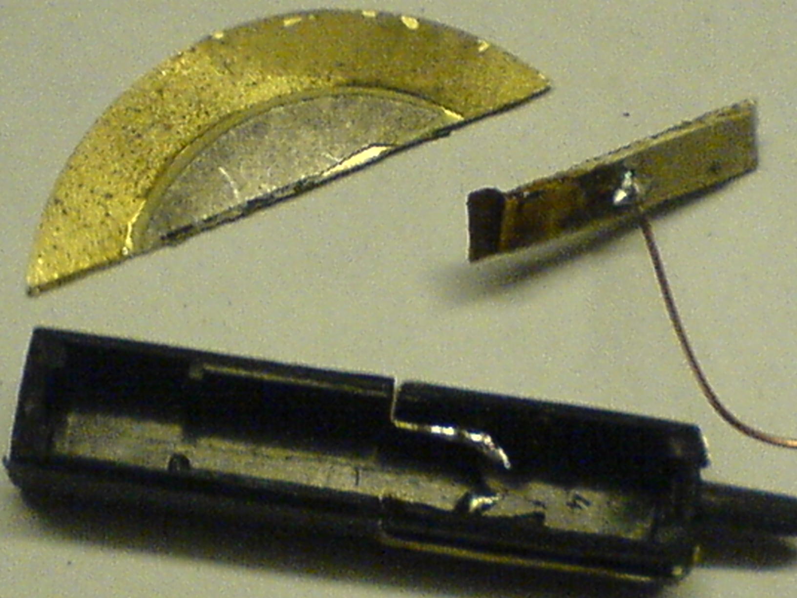 na klar doch mach ich gerne. Oben links sieht man ein Teil von dieser Membrane wo schon ein stück abgeschnitten wurde, rechts ist ein zurechtgeschnittener Streifen wo ich ein Kabel angelötet habe und unten das Gehäuse mit den Kontackten. Hier sieht man das fertige System. Es muss nurnoch die Abdeckung und die Kappe drauf dann ist es fertig. Die Klangqualität ist meiner Meinung nach die selbe nur lauter wie beim Orginal.