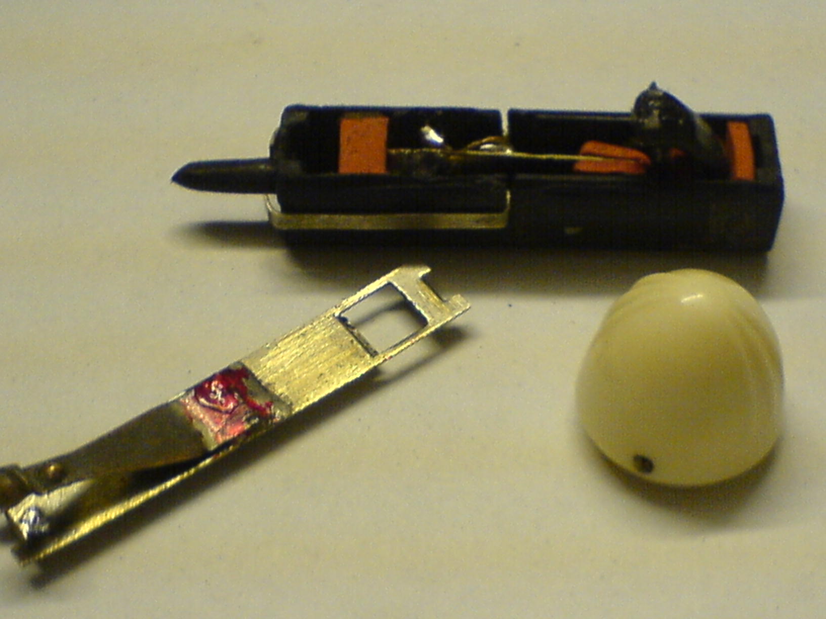 Hallo,habe heute so ein Teil teilzerlegt,er stammte vom Phonokoffer Intermezzo,der leider viel Luftfeuchtigkeit abbekam.Ein funktiosfahiges Kristallsystem muß im hochohmigen Kopfhohrer bei leichter Nadelberührung knacken.Leider werden diese Systeme durch Temperaturen über 40 Grad in Verbindung mit hoher Luftfeuchtigkeit zerstört.Eine Saphirnadel ist bereits nach 20 Betriebsstunden abgenutzt,daß starke Verzerrungen auftreten.Übrigens sollten mit diesem System keine Stereoplatten abgespielt werden,da die Nadel horizontal ausgelenkt wird und nicht wie bei Stereoplatten üblich in Flankenschrift.Das kann einerseits zur Beschädigung der Platte führen ,ebenso ist der Klang nicht optimal.Das Mittelteil 3 mit dem Gummi ist ein langer Seignettesalzkristall,der bei leichter Verbiegung eine Spannung erzeugt ,die an 2 unterschiedlichen Punkten am Kristall abgegriffen werden. Wie gesagt ein flacher Kristall,kein Pulver oder kleine Kristalle.Durch zu starke Bewegung kann der Kristall brechen und das System ist hin.Eine Reparatur gestaltet sich schwierig,da man im Falle des Taku den Kristallstreifen wechseln müßte,den man zB aus einem defekten Stereosystem,wo noch ein Kanal in Ordnung ist ausbauen müßte,was auch ein Problem darstellt,da moderne Systeme verschweißt sind.Die Saphirnadel ließe sich vorsichtig mit einem Lötkolben entfernen und eine Neue mit 2 komponentenkleber einkleben.