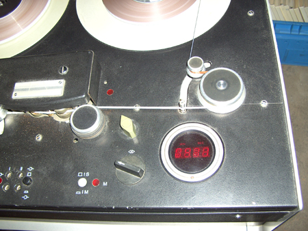 heute möchte ich meine Mechlabor STM-610 kurz vorstellen. Wie ich einer TV-Sendung entnahm, ist der jetzige Besitzer des Haus des Rundfunks Berlin, Nalepastrasse stolz noch eine Bandmaschine im Haus zu haben. Es ist eine STM-610. Die Maschine ist für 2 Bandgeschwindigkeiten ausgelegt: 38,1 und 19,05cm/s. Das 1/4'' Tonband, Schichtseite innen, wird in 2-Spur Stereo-Technik bespielt. Die Bandmaschine erfüllt selbstverständlich die Studionorm. Für 1000m Studioband auf Wickelkern (Bobby)sind die Wickelteller (29cm) mit AEG-Aufnahme vorgesehen. Es können auch Spulen benutzt werden. Leider fehlen mir die Adapter für 3-Zack-Aufnahme. Die Maschine ist mit den Verstärkereinschüben usw. in ein Stahlgestell eingebaut. Sie kann somit in Tischhöhe bedient werden und ist durch Kabelanschluss fernbedienbar. Bild 1 zeigt die Gesamtansicht. Die Bandführung ist erkennbar. Die linke Umlenkrolle besitzt aussen Schlitze, die von innen beleuchtet sind. Hier kann man stroboskopisch die Genauigkeit der Bandtransportgeschwindigkeit erkennen. Die kleine Rolle daran dient zur Bandzugregelung. Links befinden sich die Bedientasten. Die linke Taste dient dem Umspulen. Richtung und Geschwindigkeit werden jedoch mit dem schwarzen Knebelschalter mit Pfeil rechts geregelt (Rangierschalter). Daneben befindet sich das elektronische Bandzählwerk, welches bis auf 1/10 Sekunden genau anzeigt. Der Schalter über dem Rangierschalter ist leider nicht original. Er dient zum Anschwenken des Tonbandes während des Umspulens zum Mithören. Leider fehlt auch die Abdeckhaube der Maschine. Die linke Rolle vor dem Kopfträger drückt das Band bei A/W an die 3 Köpfe. Rechts befindet sich die Andruckrolle. Vorn in der Mitte sind unsymetrische Ein- und Ausgänge für Bananenstecker vorhanden. Ansonsten arbeitet die Maschine mit symetrischen Tonsignalen, wie in der Studiotechnik üblich. Die Anschlüsse (XLR) dazu befinden sich auf der Rückseite. Weitere Fotos sind erst möglich wenn die Maschine an ihrem endgültigen Standort steht.