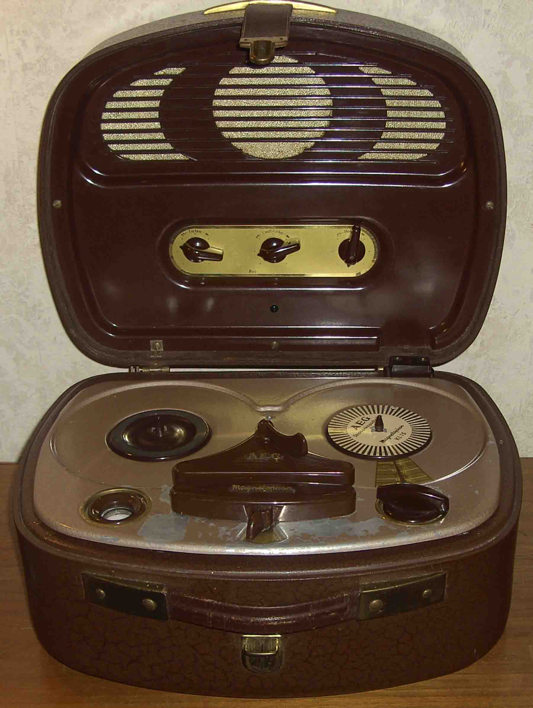 hier möchte ich das KL 15 vorstellen, welches 1951 das erstes AEG-Heimton- bandgerät war. Mein Gerät KL 15D ist eine spätere Version mit Verstärker und Lautsprecher im Deckel. Das Tonbandgerät arbeitet mit der Bandgeschwindigkeit 19 cm/s in Halbspurtechnik und deutscher Spurlage. Der Frequenzbereich geht, wie damals üblich, von 50 bis 10.000 Hz. Es können Spulen bis 18 cm Durchmesser verwendet werden. Eine Besonderheit ist, daß das Gerät mit entsprechendem Zubehör als Platten- spieler mit 78 U/min verwendet werden kann. Auch eine Verwendung als Diktiergerät ist vorgesehen. Dazu kann ein Diktathebel aufgesteckt werden. Durch Benutzung dieses Hebels kann bei Wiedergabe der Bandlauf unterbrochen werden oder man kann das Band kurz zurück laufen lassen. Dabei braucht der Betriebsartenschalter nicht betätigt werden. Das Gerät besitzt eine Bandendabschaltung. Für die Aufnahme wird ein Röhrenradio benötigt. Das Tonbandgerät wird mit dem beigefügten Anschlußkabel mit dem Lautsprecherausgang verbunden und die Aufsprechspannung muß mit dem Lautstärkeregler des Radios eingestellt werden. Die Kontrolle erfolgt mit dem Magischen Fächer am Tonbandgerät. Dazu ist noch zu bemerken, daß mit dem vorhandenen Löschkopf automatisch vorhandene Aufnahmen gelöscht werden. Nach der Aufnahme kann das Band zurückgespult oder für Aufnahmen auf Spur 2 gewendet werden. Ein Nachteil des Gerätes ist, daß die Geschwindigkeit stroposkopisch mit einem Hebel nachgeregelt werden muß. Wie auf den Bildern ersichtlich, hat das Tonbandgerät einige Mängel. Die Farbe der Frontplatte blättert teilweise ab. Wahrscheinlich wurde das Blech vor der Lackierung nicht ausreichend gereinigt. An der Lautsprecherblende fehlt eine Strebe, die durch Schließen des Deckels bei aufgestecktem Diktathebel herausgebrochen sein kann. Sonst ist das Gerät für sein Alter in einem guten Zustand.